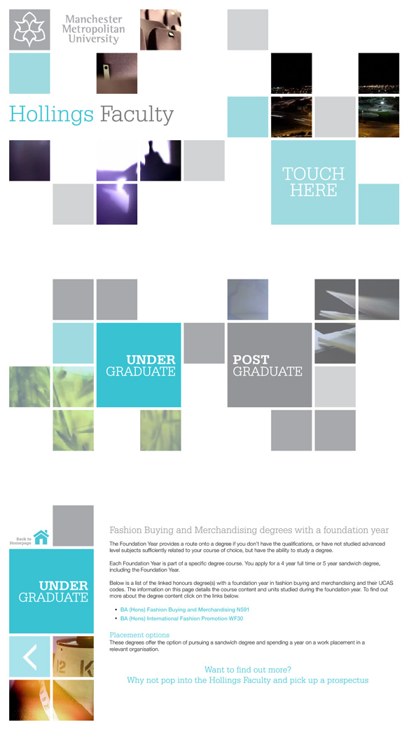 This is a flash presentation for a touch screen monitor at the Manchester Metropolitan University. The purpose of this presentation was to show the faculties course directory as well as the relevant information regarding that course to prospective students.